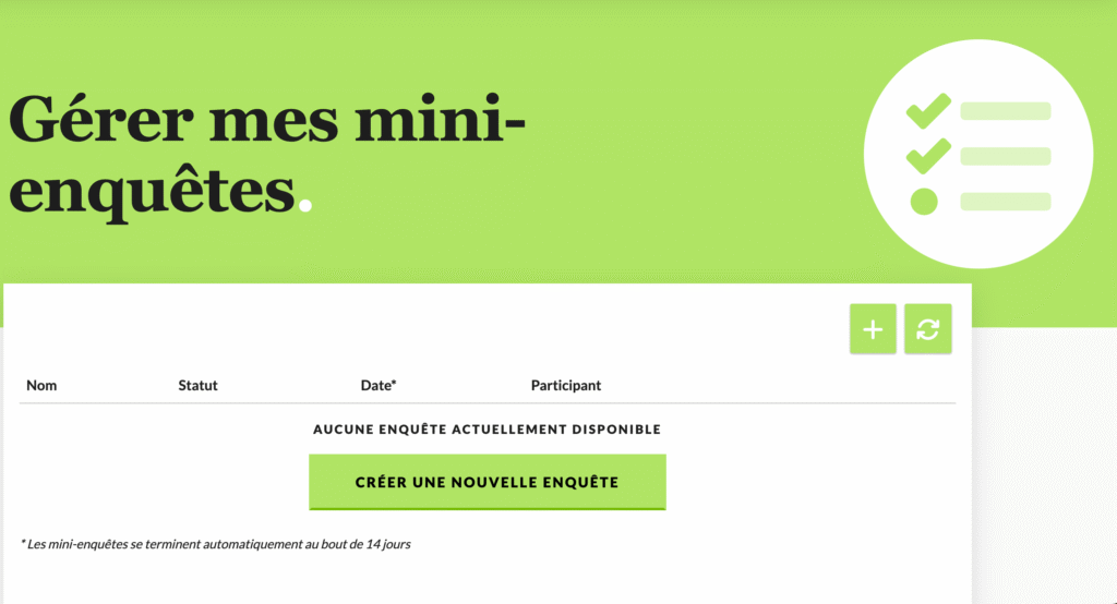 - Tu reçois ou tu consultes des sondages disponibles. Le nombre dépend de ton profil.
