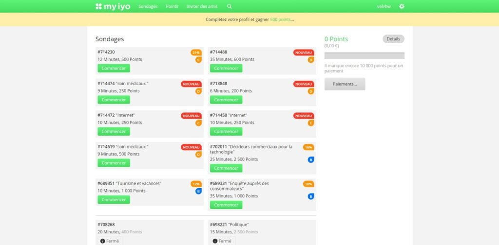 - Tu peux voir pour chaque sondage le nombre de points/récompense proposé et le temps estimé.